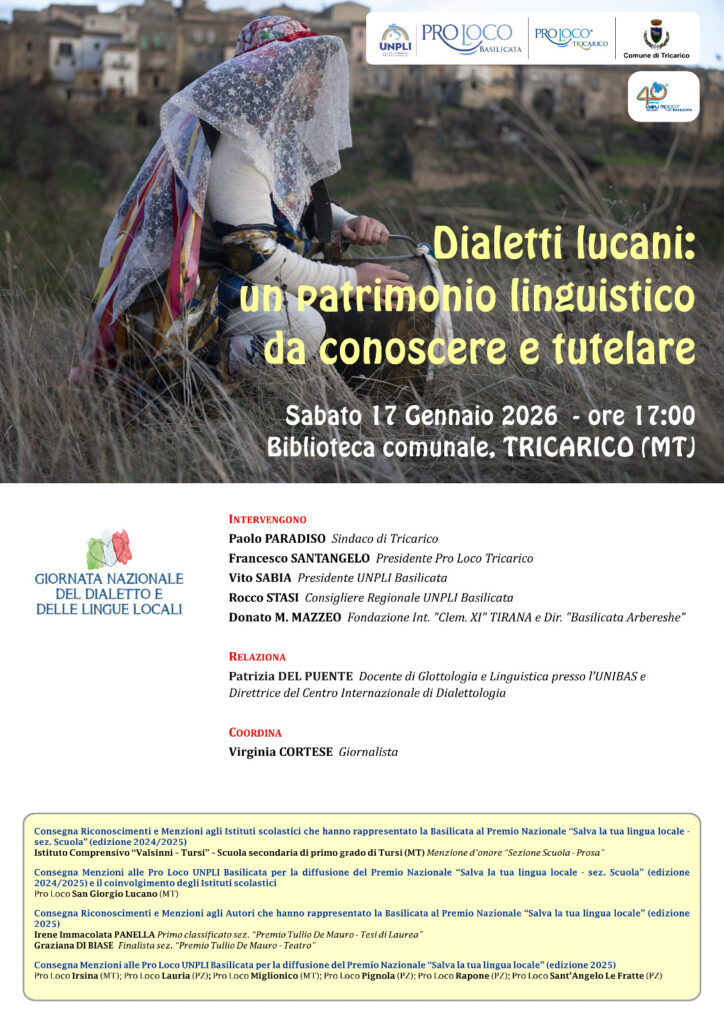 Il prossimo sabato 17 gennaio, a partire dalle ore 17:00, nella Biblioteca comunale di Tricarico (MT), l’UNPLI Basilicata ospiterà l’incontro sul tema “Dialetti lucani: un patrimonio linguistico da conoscere e tutelare”, promosso in occasione della Giornata nazionale del Dialetto e delle lingue locali. All’importante iniziativa, organizzata in collaborazione con la Pro Loco di Tricarico e con il patrocinio del comune di Tricarico, prenderanno parte Paolo Paradiso, Sindaco del comune del materano, Francesco Santangelo, Presidente della Pro Loco di Tricarico, Vito Sabia, Presidente dell’UNPLI Basilicata, Rocco Stasi, Consigliere regionale dell’UNPLI Basilicata e Donato M. Mazzeo, della Fondazione Int. “Clem. XI” Tirana e Direttore di “Basilicata Arbereshe”. Il momento di riflessione sarà impreziosito dalla relazione di Patrizia Del Puente, Docente di Glottologia e Linguistica presso l’UNIBAS e Direttrice del Centro Internazionale di Dialettologia.