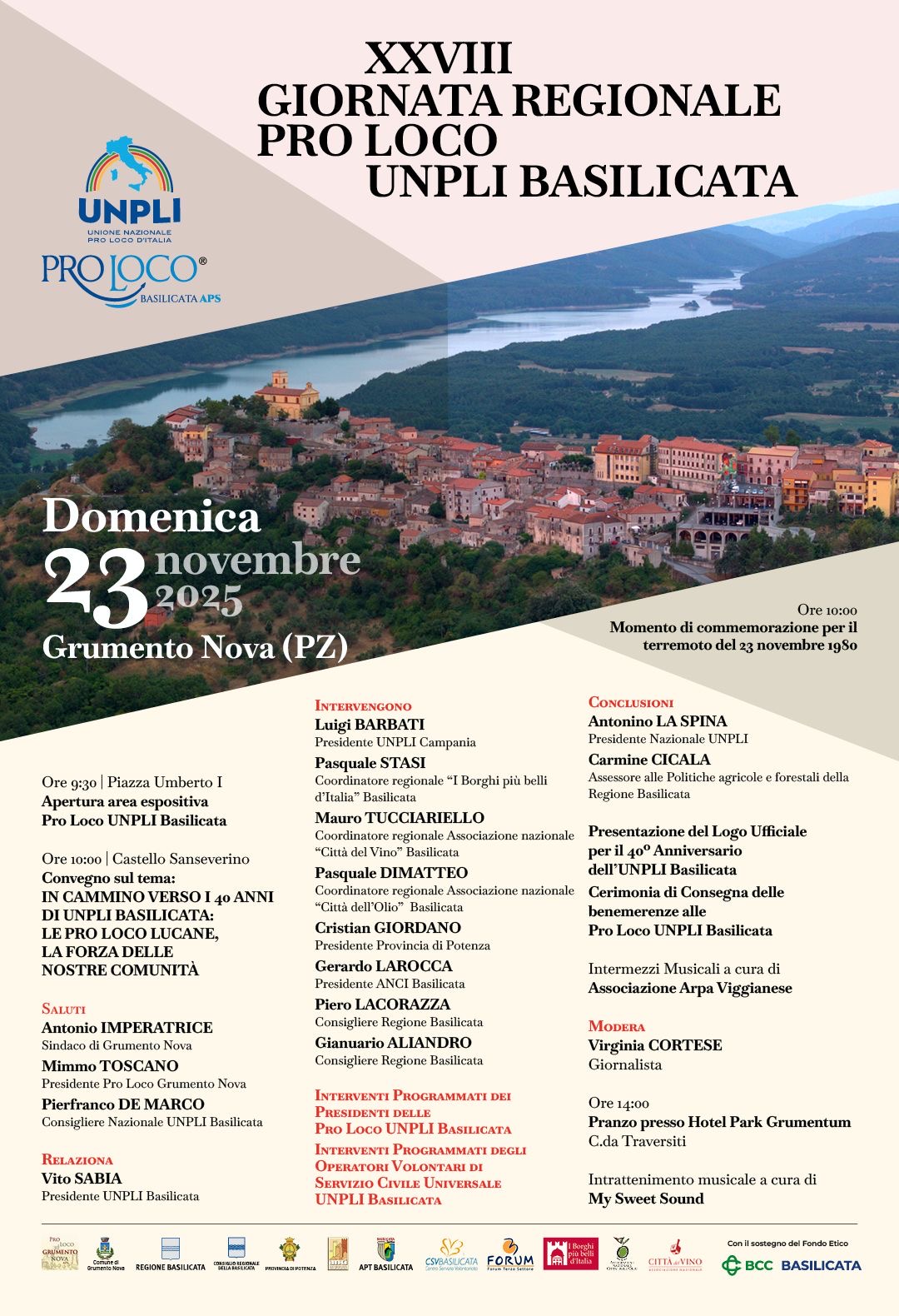 Domenica 23 novembre 2025, dalle ore 10.00, il Castello Sanseverino di Grumento Nova ospiterà la XXVIII Giornata regionale delle Pro Loco UNPLI Basilicata.